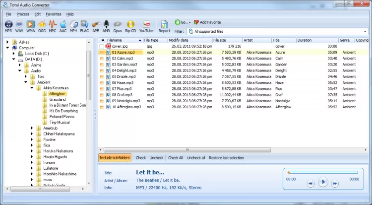 CoolUtils Total Audio Converter — это мощный инструмент для конвертации аудиофайлов, объединяющий в себе функции CD-граббера, риппера, редактора тегов и встроенного плеера. Программа поддерживает более 30 форматов, включая MP3, FLAC, WAV, OGG, WMA, AAC, APE и многие другие. Благодаря интеграции с Windows и простому пошаговому интерфейсу, Total Audio Converter одинаково удобен как для новичков, так и для профессионалов.