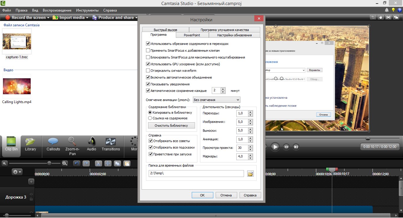 - Camtasia Studio — монтаж, редактирование и экспорт.