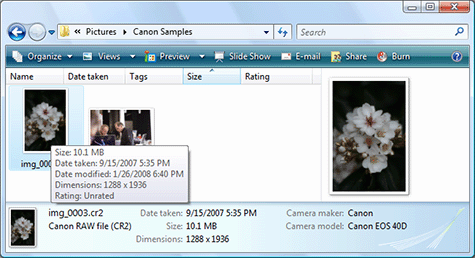 Проверена работоспособность на Windows 7. Репак версии Lexap не требует активации, установка полностью автоматизирована. После инсталляции достаточно перезапустить Проводник Windows, чтобы миниатюры CR2 начали отображаться.