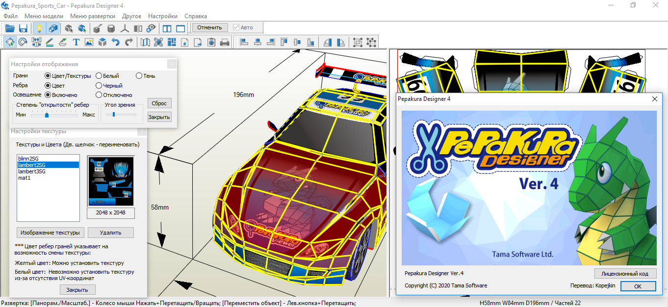 - Pepakura Designer: основное приложение для создания и редактирования бумажных выкроек из 3D-моделей. Достаточно импортировать модель (3DS, DXF, OBJ, STL, LWO, KML и др.), развернуть её на плоскость и распечатать результат.