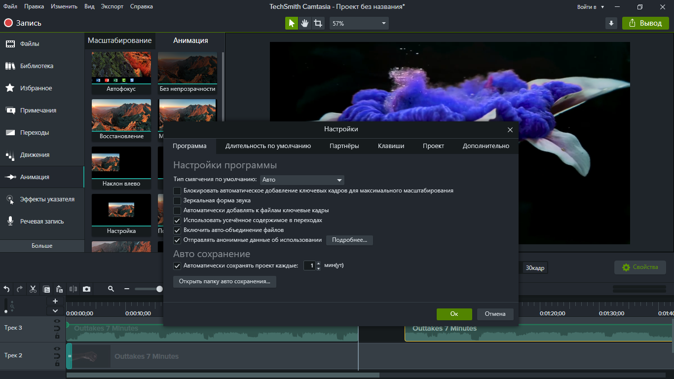 - Экспорт и публикация: MP4 (H.264/AVC), WMV, MOV, GIF, M4A/MP3; пакет локальных пресетов.