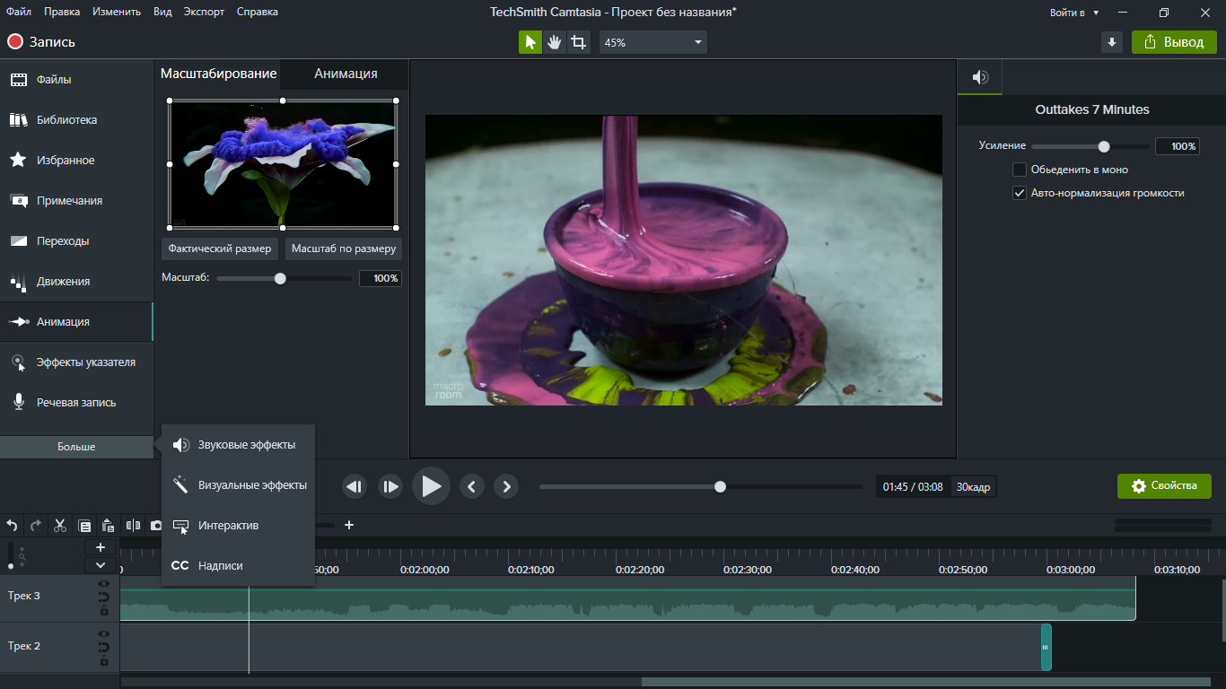 - Визуальные эффекты, переходы, аннотации, курсор-эффекты, субтитры и квизы.