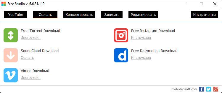 - Скачивание: Free Torrent Download, Free Instagram Download, SoundCloud Download, Vimeo Download, Free Dailymotion Download.