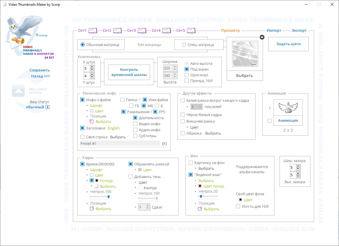 - Работа с пресетами: импорт и экспорт настроек в формате *.vtm, пять готовых шаблонов.