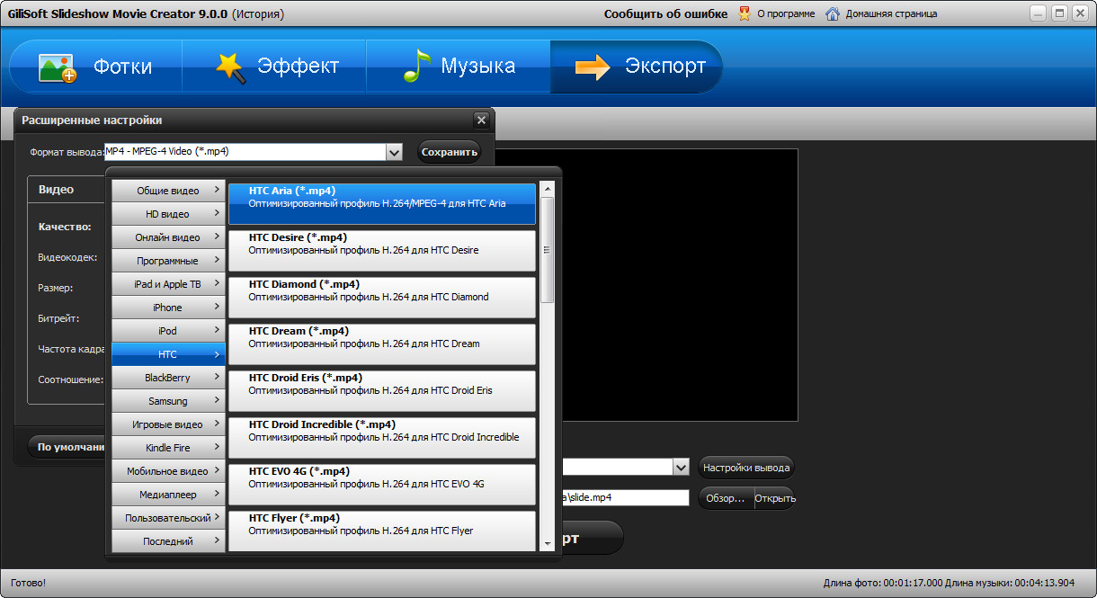 - Аудио-поддержка: импорт музыки, регулировка громкости, запись собственного комментария микрофоном.