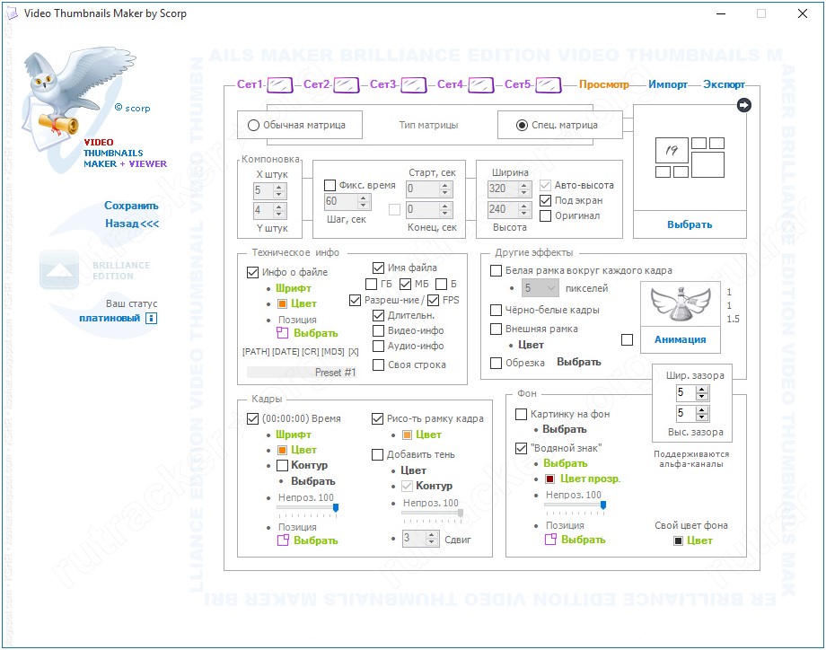 - Водяные знаки: поддержка PNG с прозрачностью и альфа-каналами.
