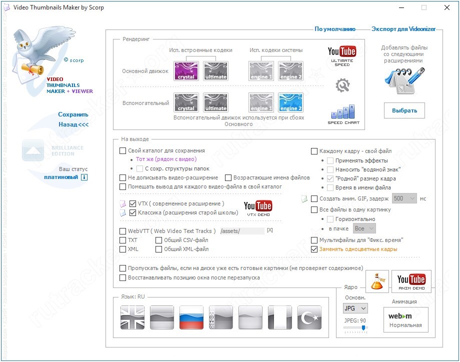 - 3 движка рендеринга: для разных систем, Engine 2 рекомендуют для 64-bit ОС.