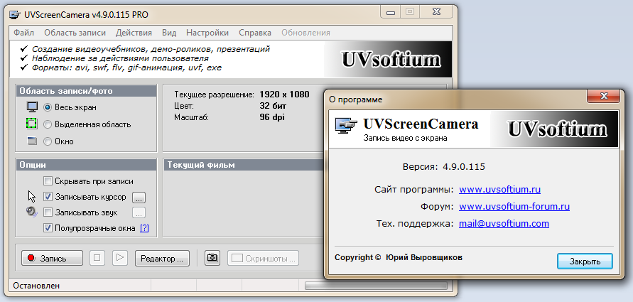 - Сайт разработчика: http://www.uvsoftium.ru/UVScreenCamera.php