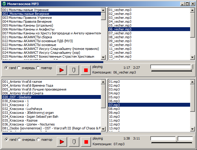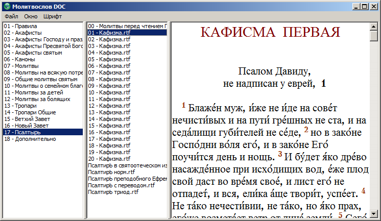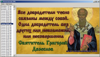 Православный молитвослов "Праведная молитва" 1 Build 11 — электронный молитвослов, содержащий более 2000 молитв в текстовом виде и свыше 250 молитв в аудиоформате с профессиональным церковным чтением. В сборник включены утренние и вечерние молитвенные правила, Псалтырь, каноны, акафисты, Новый Завет и поучения святых отцов. Часть текстов приведена с ударениями для правильного чтения, поддерживаются церковно-славянские шрифты с ударениями. Программа позволяет прослушивать молитвы, редактировать фонотеку, добавляя или удаляя записи по своему усмотрению, а также работать с текстами в удобном интерфейсе с поиском и закладками.