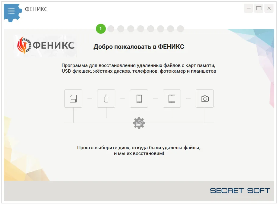 Основной принцип работы «Феникса» — простота. Программа ведёт пользователя поэтапно: выбор диска → настройка параметров → сканирование → просмотр найденных файлов → восстановление. Такой алгоритм полностью исключает вероятность ошибки. Каждый шаг сопровождается подсказками на русском языке и пояснительными иллюстрациями.