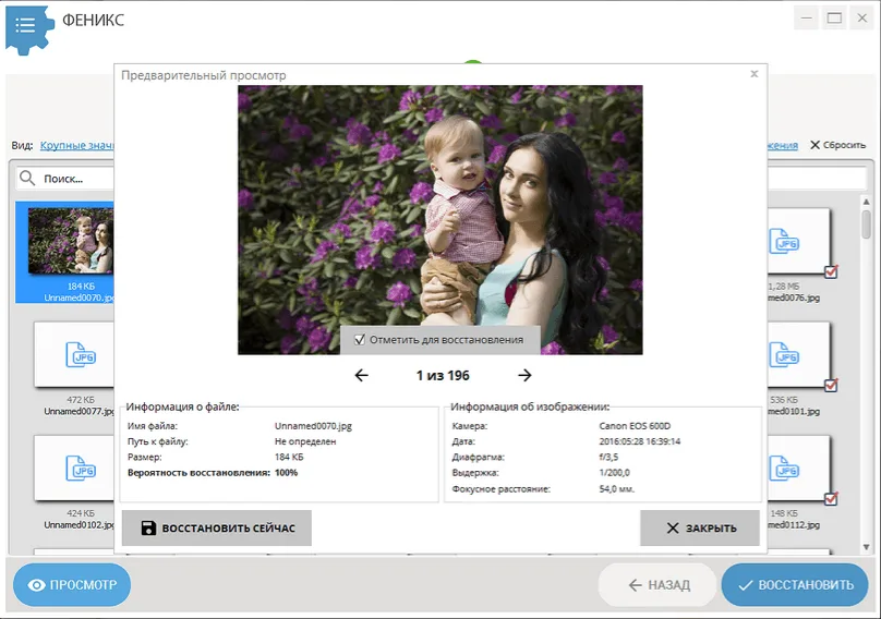 Одно из самых распространённых применений программы — восстановление фотографий и видеозаписей с карт памяти камер и телефонов. «Феникс» находит изображения даже после удаления, форматирования или сбоя файловой системы. Поддерживаются форматы RAW, JPG, PNG, MOV, MP4 и другие. Это делает программу незаменимым инструментом для фотографов, видеомейкеров и обычных пользователей, потерявших личные снимки.