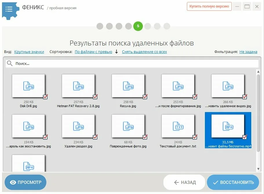 Чтобы облегчить поиск нужных данных, «Феникс» предлагает фильтрацию результатов. Можно отсортировать файлы по типу (фото, видео, документы), дате создания, размеру или имени. Это особенно удобно при работе с большими носителями, где количество найденных объектов может достигать тысяч.