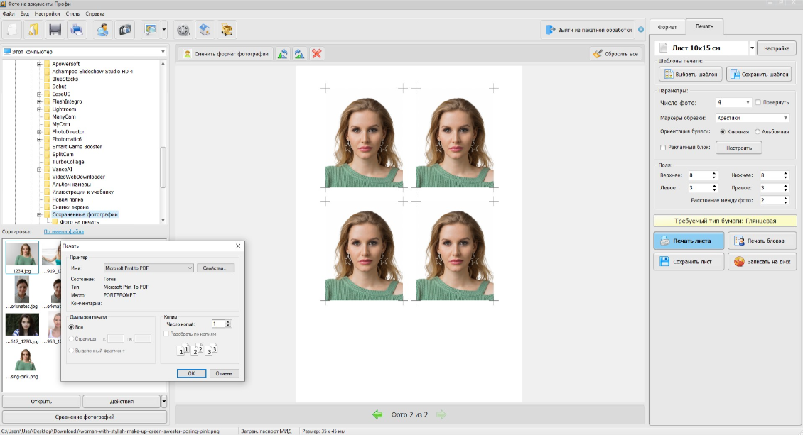«Фото на документы ПРОФИ» позволяет печатать снимки напрямую, без использования Photoshop или сторонних программ. Интерфейс модуля печати интуитивен: выбирается формат бумаги (10×15, A4 и др.), количество фото, ориентация и поля. Можно задать количество копий на странице, что особенно полезно при массовой печати в студиях.