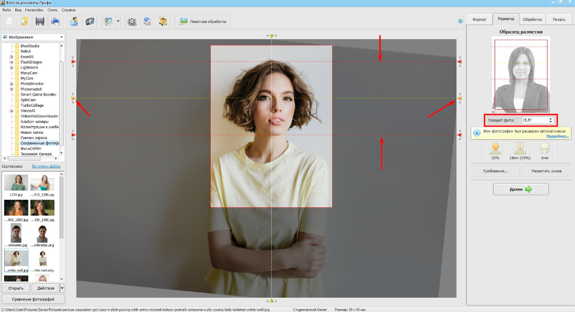 Одна из ключевых функций программы — интеллектуальное распознавание лица. Алгоритм анализирует снимок, определяет положение головы и глаз, автоматически выравнивает портрет по вертикальной и горизонтальной осям. Это обеспечивает точное соответствие биометрическим требованиям, что особенно важно при подготовке визовых и паспортных фото.