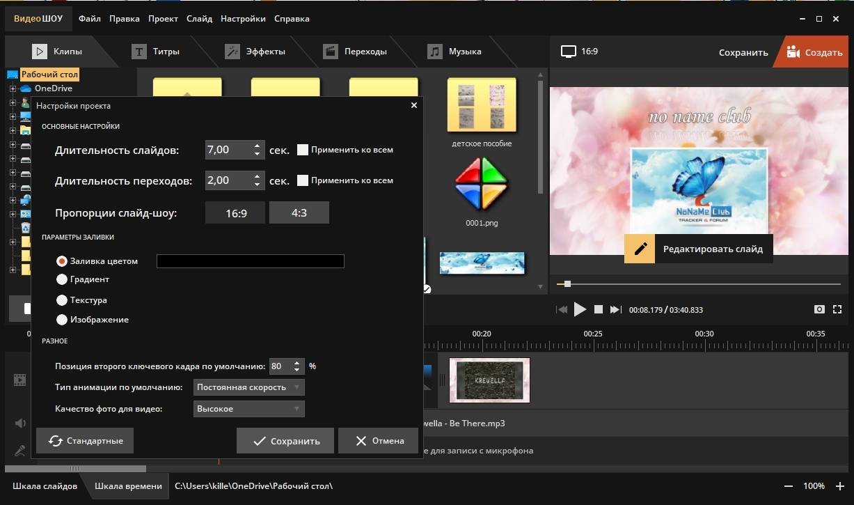 Пользователь может записать собственный голос прямо в программе и добавить его к ролику. Это особенно удобно при создании видеопрезентаций или обучающих роликов. Программа автоматически выравнивает озвучку по длительности и ритму слайда. Также реализована функция синхронизации — изображение и переходы подстраиваются под темп выбранной музыки.