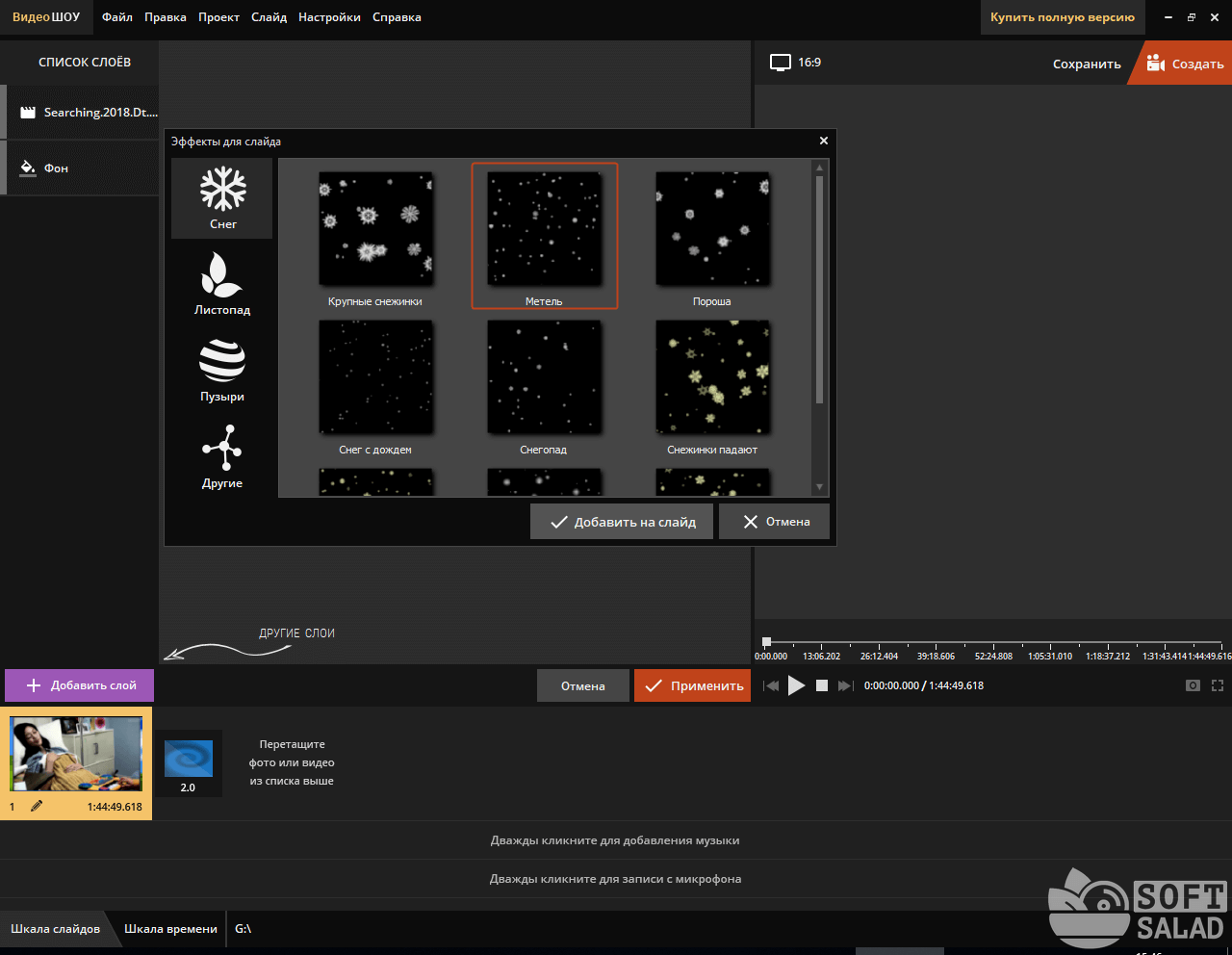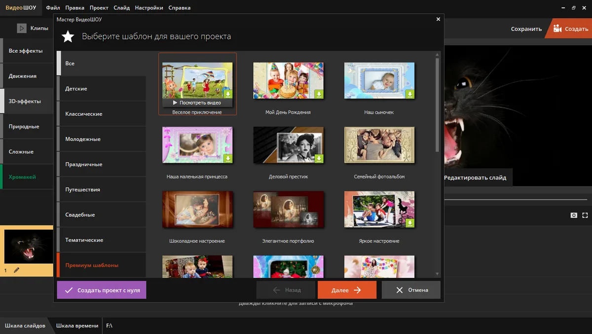 Для быстрого старта в «ВидеоШОУ» реализован мастер создания слайд-шоу. Пользователь выбирает тему — например, «Свадьба», «Путешествие», «Поздравление» или «Детский альбом» — после чего программа автоматически подбирает эффекты, переходы и музыку. Такой режим позволяет создать готовое видео буквально за несколько минут.
