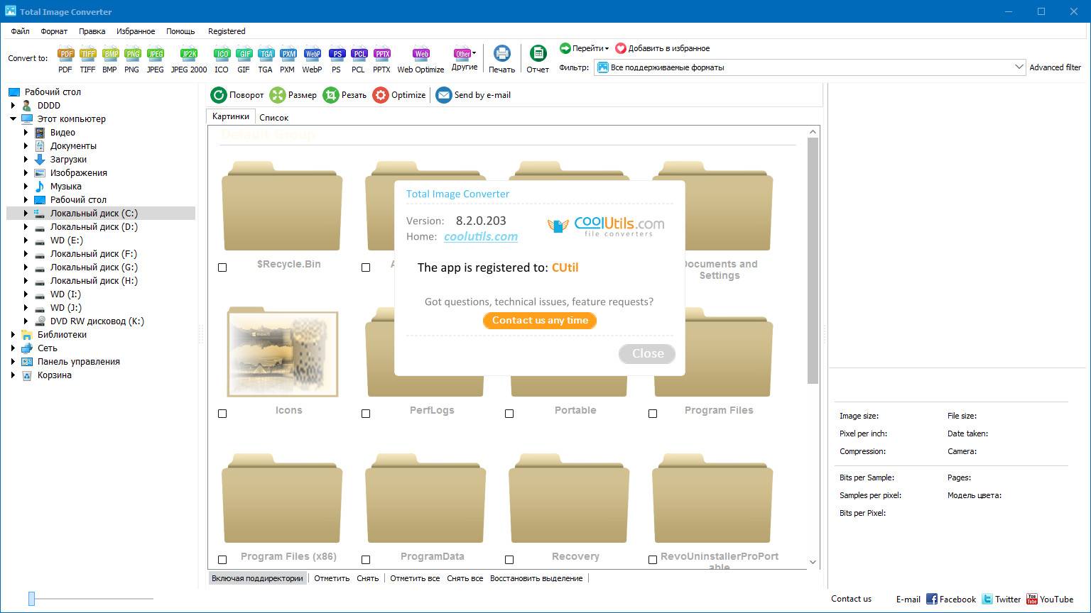 CoolUtils Total Image Converter v5.1.58 — мощный универсальный конвертер изображений, который за секунды преобразует тысячи файлов в нужный формат, меняет размер, поворачивает, кадрирует, добавляет водяные знаки с текстом, логотипом или датой и поддерживает более 30 форматов, включая редкие RAW от Canon/Nikon/Sony, многстраничные TIFF, PSD, WMF, ICO и другие. Полностью русскоязычный интерфейс, интеграция в контекстное меню Windows (правой кнопкой мыши → «Конвертировать в»), пакетная обработка папок целиком, встроенный просмотрщик с эскизами, поддержка командной строки и мастер-подсказки для новичков делают программу идеальным инструментом для веб-дизайнеров, фотографов и всех, кому нужно быстро привести сотни или тысячи изображений к единому виду без потери качества.