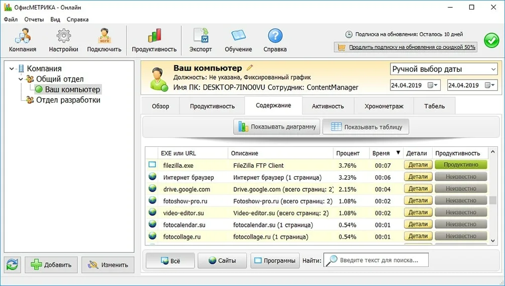 Система отслеживает использование офисных, корпоративных и сторонних программ. Руководитель может увидеть, сколько времени сотрудник работает, например, в Microsoft Excel или CRM-системе, а сколько — проводит в браузере. Это позволяет объективно оценить эффективность рабочего процесса без необходимости ручной проверки.