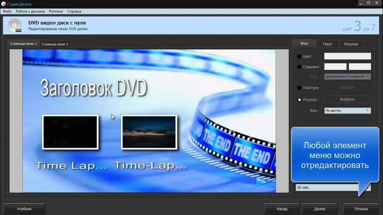 - Авторинг видео-DVD. Возможность добавить меню, главы и фоновые треки.