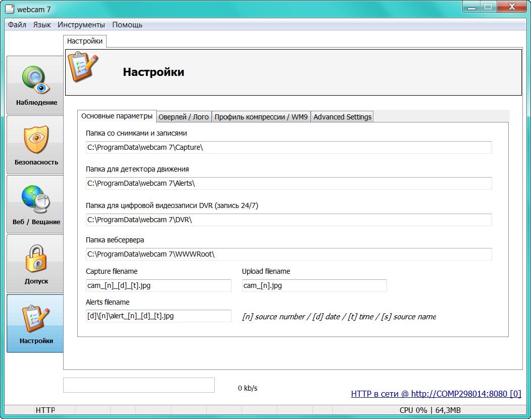 Webcam 7 PRO v1.2.5.0 Build 39560 — мощнейшая профессиональная программа для создания полноценного видеонаблюдения, онлайн-трансляций и веб-камерного сервера прямо на вашем компьютере без установки дополнительного серверного ПО. Она поддерживает до 10 веб-камер или IP-камер одновременно, позволяет транслировать видео по HTTP/HTTPS, Windows Media Streaming, Flash, Java и jаvascript, отправлять картинку по FTP/FTPS и HTTP/HTTPS, записывать видео по расписанию или по детектору движения/звука, вести постоянный DVR-архив с автоудалением старых записей, накладывать текст, логотипы, изображения и эффекты в реальном времени с альфа-смешиванием, управлять PTZ-камерами (панорамирование, наклон, зум) локально и удалённо, блокировать доступ по IP и паролю, вести интегрированный чат и показывать список подключённых зрителей и администрировать всё через веб-интерфейс. Полностью на русском языке, работает на Windows XP–8 и серверах 2003–2012, идеально подходит для домашнего видеонаблюдения, охраны, трансляции животных или онлайн-шоу.