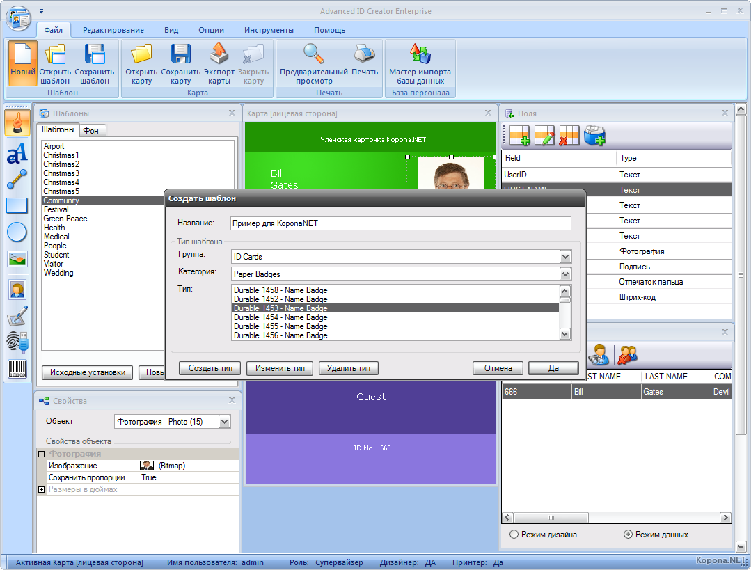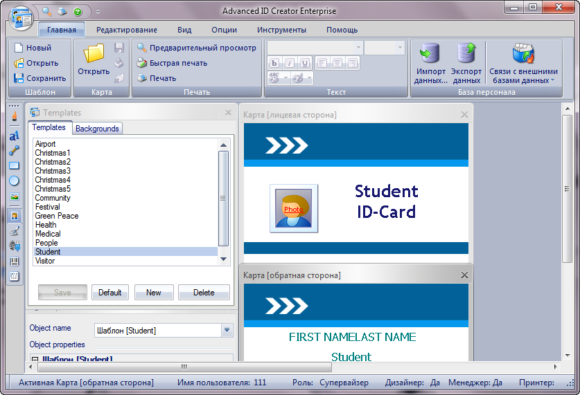 - Создание визиток и бейджей с готовыми или кастомными шаблонами