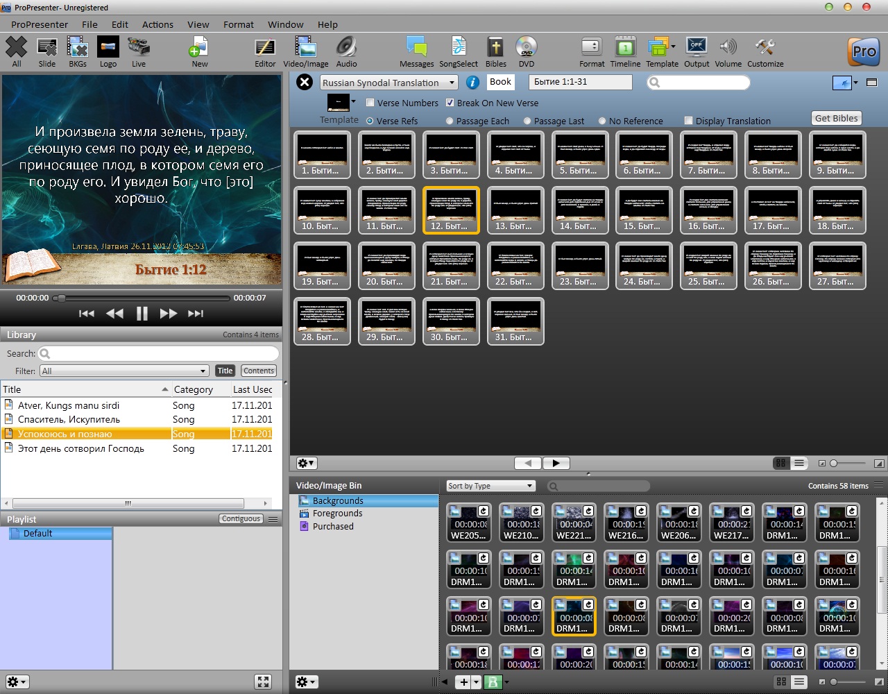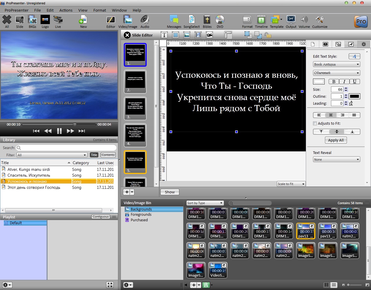 ProPresenter 5.1.0 Build 1 — программа для создания и управления многоэкранными презентациями в реальном времени, применяемая на конференциях, спортивных мероприятиях, церковных службах и телевизионных трансляциях с поддержкой наложения нескольких слоёв текста, изображений, анимаций и видеопотоков. Интерфейс позволяет одновременно выводить контент на основной экран, монитор оператора и дополнительный дисплей для сцены, управлять слайдами с горячими клавишами, триггерами и таймерами, интегрировать библии с поиском по стихам и быстрым переходом, работать с видеоформатами QuickTime, MPEG, AVI в полноэкранном режиме или как фоном. Программа поддерживает импорт из PowerPoint, DVD, динамические тикеры для бегущей строки, альфа-канал для прозрачности, мастер настройки для нескольких экранов и экспорт презентаций в видео или изображения.