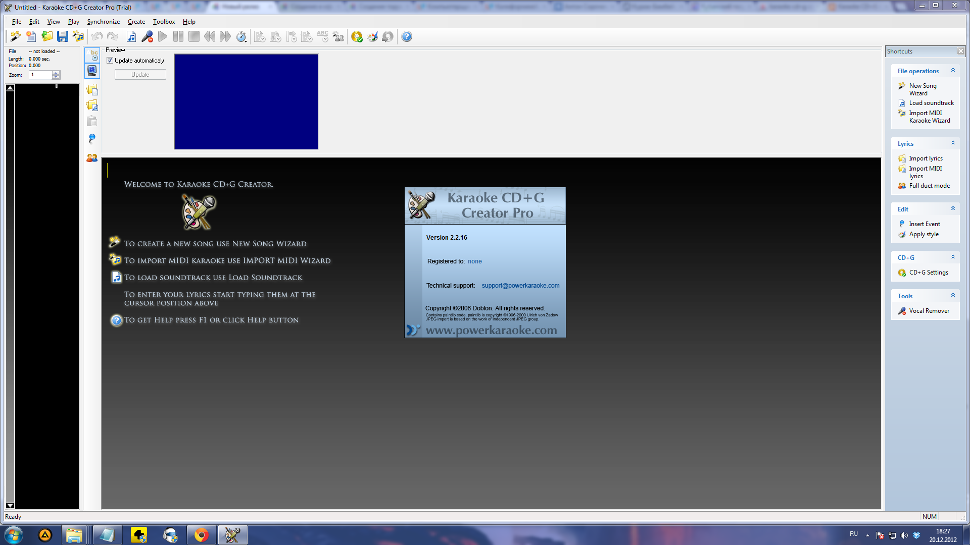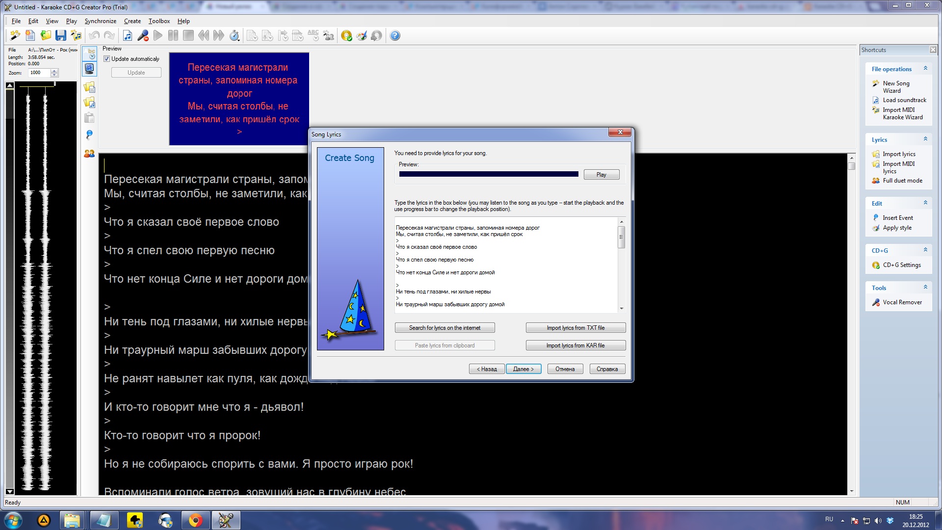 Karaoke CD+G Creator pro 2.2.16 — программа для создания караоке-треков в формате CD+G на основе MP3 или WAV-файлов, позволяющая вводить текст песни вручную или импортировать из текстовых файлов, синхронизировать слова с музыкой с помощью простого редактора, где во время воспроизведения нажимается пробел на начале каждого слова, и настраивать внешний вид слайдов с выбором шрифтов, цветов, теней, контуров, фоновых изображений и эффектов отображения. Русскоязычный интерфейс, поддержка удаления вокала из обычных записей с помощью Power Vocal Remover, импорт MIDI-караоке с конвертацией в CD+G, добавление титульных и кредитных экранов, обратного отсчёта для певцов, изменение количества строк на экране и выравнивания текста, вставка изображений в любой момент песни с различными эффектами перехода, создание пользовательских стилей и предварительный просмотр результата позволяют готовить профессиональные караоке-диски или файлы BIN/CDG для записи или использования на компьютере. Программа включает визуальный редактор синхронизации для коррекции ошибок, замедленное воспроизведение до 2x для точной настройки быстрых песен, повтор уже синхронизированных строк, графические метки для смены подсветки и сохранение проектов для дальнейшей работы или экспорта в Power Video Karaoke.