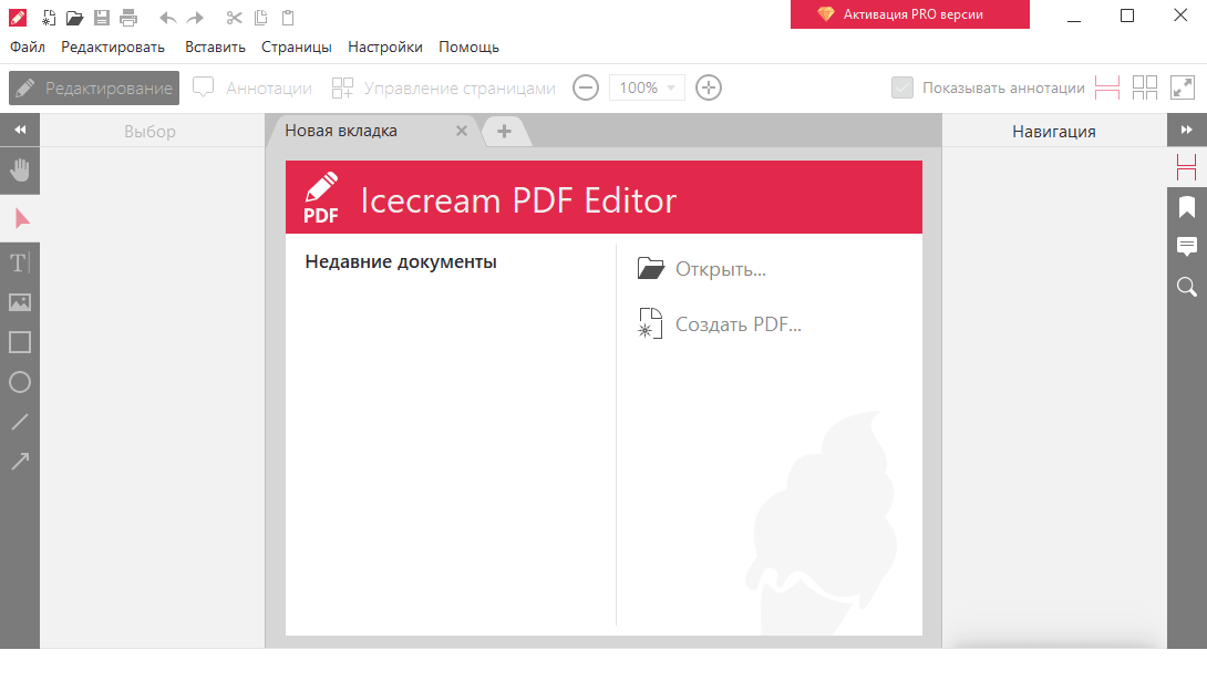 При запуске Icecream PDF Editor пользователь сразу видит чистый и лаконичный интерфейс. Основные элементы: