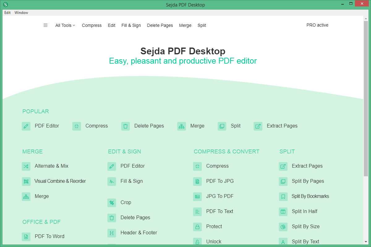 Sejda PDF Editor — это многофункциональный PDF-редактор, доступный в двух вариантах: онлайн-версия, работающая в браузере, и десктоп-приложение, доступное для установки на компьютер. Такое сочетание делает Sejda удобным и гибким инструментом, подходящим как для быстрых правок «на ходу», так и для полноценной локальной работы с документами.