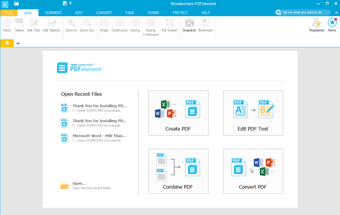 Главное окно PDFelement построено по принципу современного офисного ПО: крупные кнопки, понятные подписи, чистая структура, отсутствие лишних элементов и быстрый доступ к инструментам. Пользователь сразу видит: