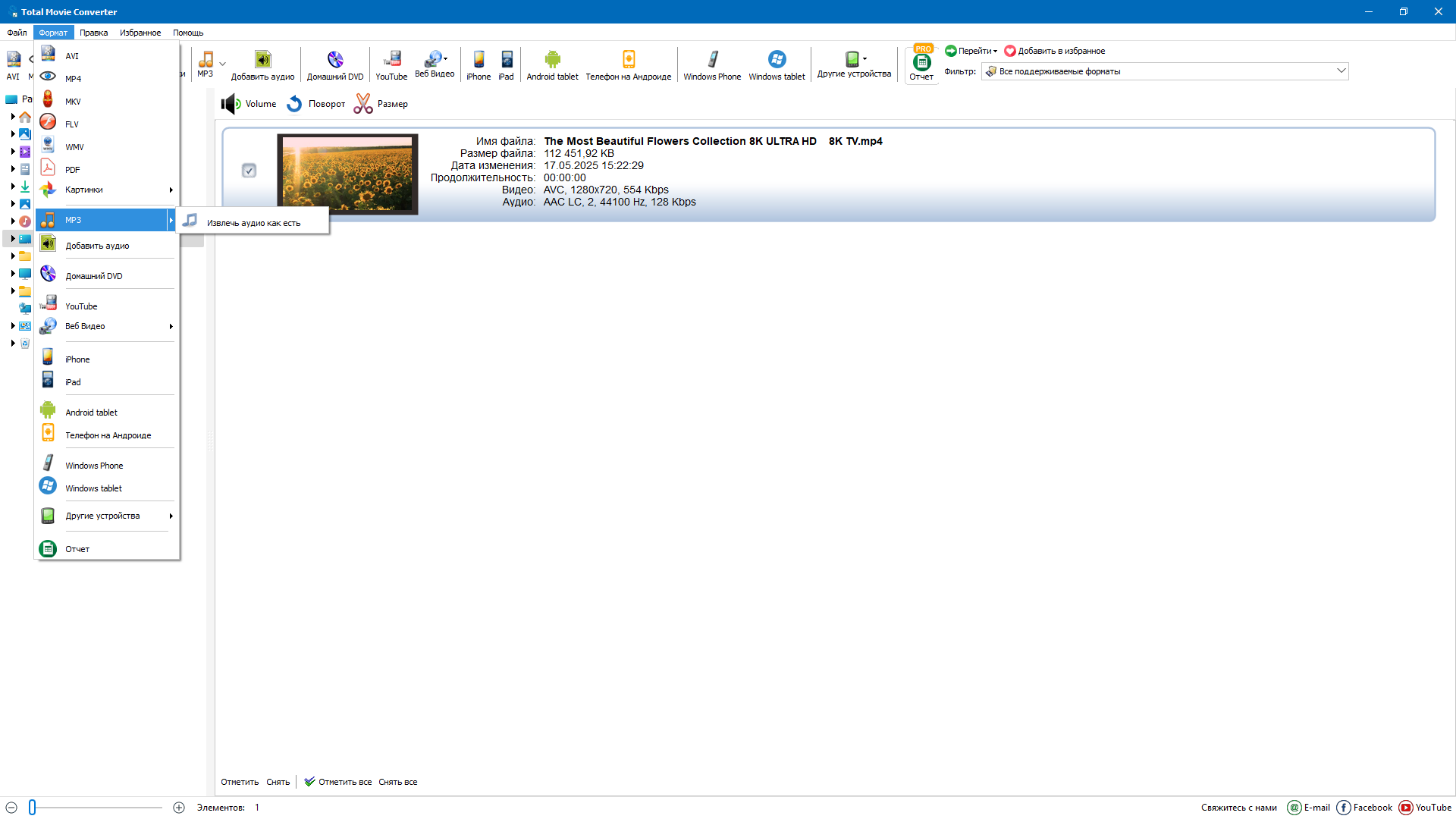 - Конвертирование в AVI, MPG, WMV, MPEG, FLV, MP4, MKV, MOV, 3GP и другие популярные форматы