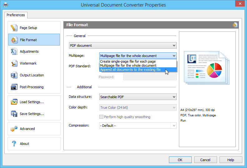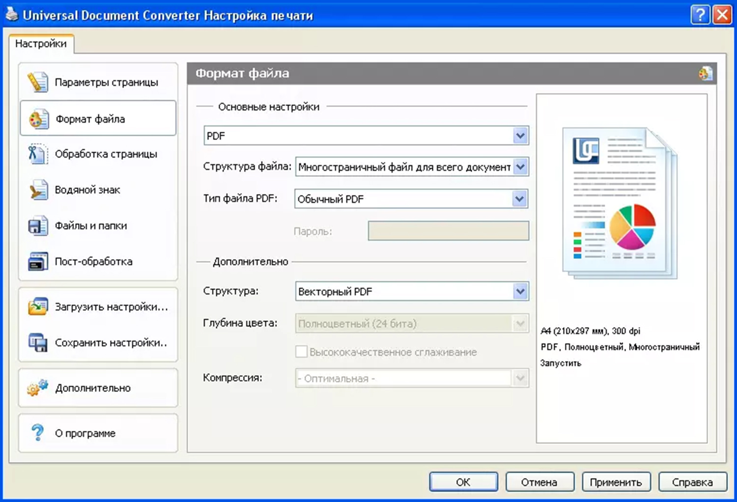 Одним из ключевых преимуществ Universal Document Converter является широкий набор параметров для точной настройки конечного результата. Программа позволяет пользователю полностью контролировать процесс конвертации — от выбора формата файла до глубокой корректировки цвета и сжатия.