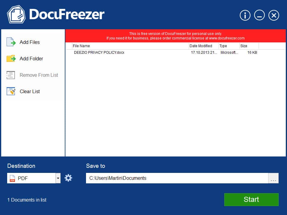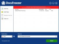 DocuFreezer имеет лаконичный и понятный интерфейс, не перегруженный лишними элементами. Даже пользователи без технических знаний смогут освоить программу за несколько минут. Вся работа выполняется через единое окно, где находятся список файлов, панель параметров и кнопки запуска.