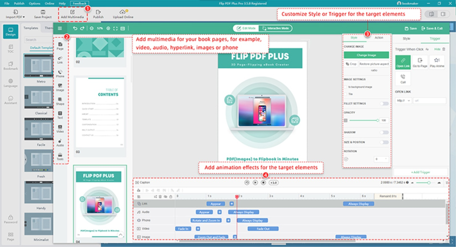 Flip PDF сочетает функциональность редактора, конструктора и инструмента для публикации. Программа позволяет пользователю импортировать PDF-документ и буквально за несколько минут получить интерактивный журнал с реалистичной анимацией перелистывания страниц, возможностью добавления видео, ссылок, музыки и кнопок. Полученные публикации можно распространять офлайн (в формате EXE, ZIP или App) или публиковать онлайн в HTML5-версии для веб-сайтов.