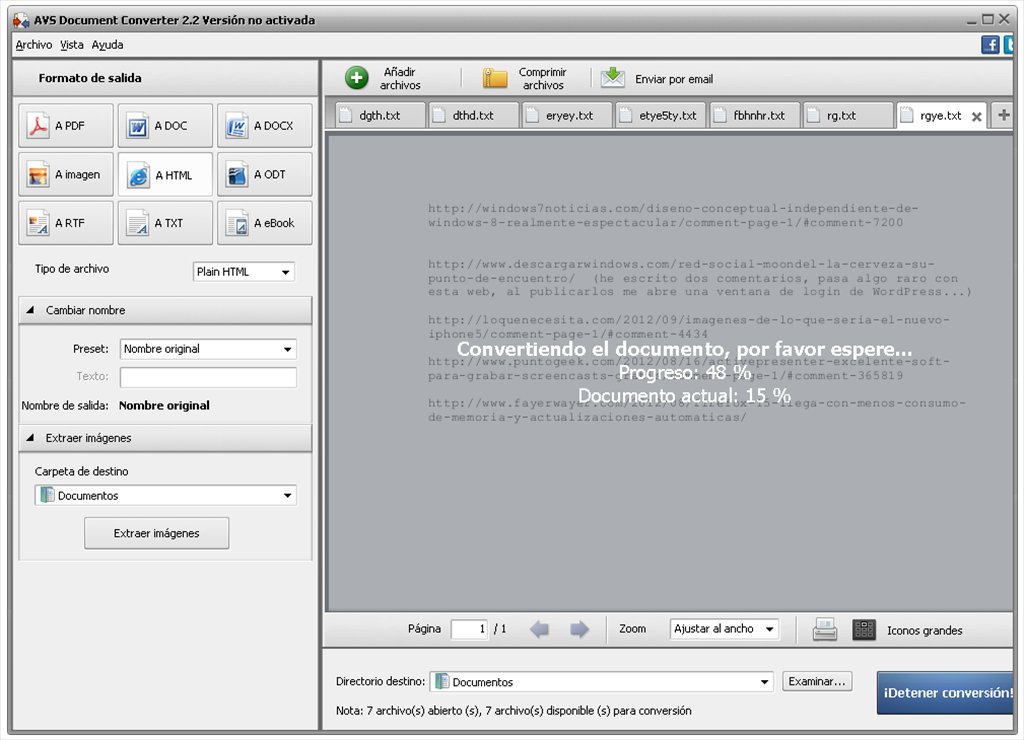 - Конвертация документов между десятками форматов. Поддерживаются PDF, DOC, DOCX, RTF, TXT, ODT, HTML, EPUB, MOBI, а также изображения (JPG, PNG, TIFF, BMP, GIF).