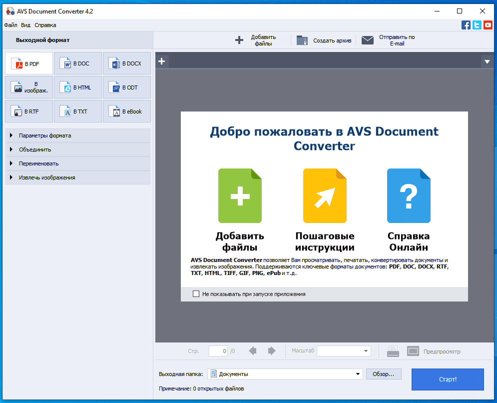 Интерфейс AVS Document Converter выполнен в стиле классических офисных приложений и интуитивно понятен даже для новичков. Все основные функции размещены в одном окне и сгруппированы по логическим вкладкам: «Добавить файлы», «Выходной формат», «Параметры», «Конвертировать». Такой подход позволяет выполнять все операции без перехода между экранами и дополнительных окон.