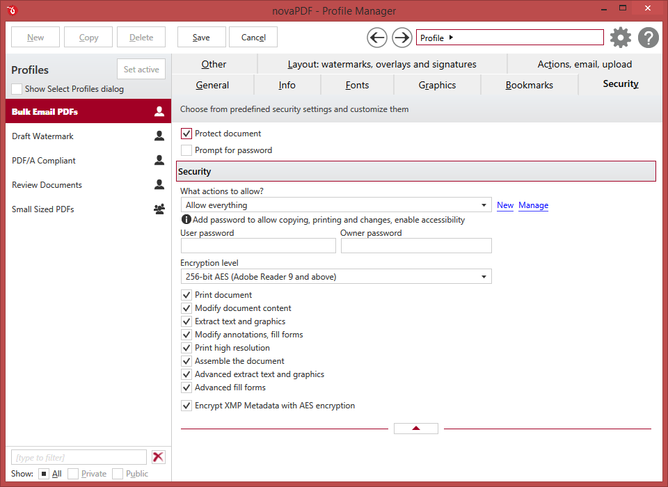 Пользователь может заранее задать параметры безопасности для определённого типа документов. Например, для отчётов — запрет редактирования, для контрактов — полный доступ только по паролю. Эти параметры сохраняются в профиле, и novaPDF применяет их автоматически при создании нового файла.