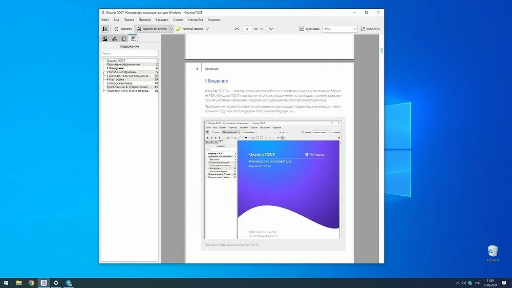 Окуляр ГОСТ обеспечивает качественное отображение текстов, таблиц и графики. Пользователь может масштабировать страницы, переключать режимы отображения (страница, разворот, непрерывный режим), а также использовать полноэкранный просмотр для презентаций и лекций.