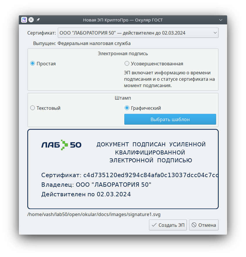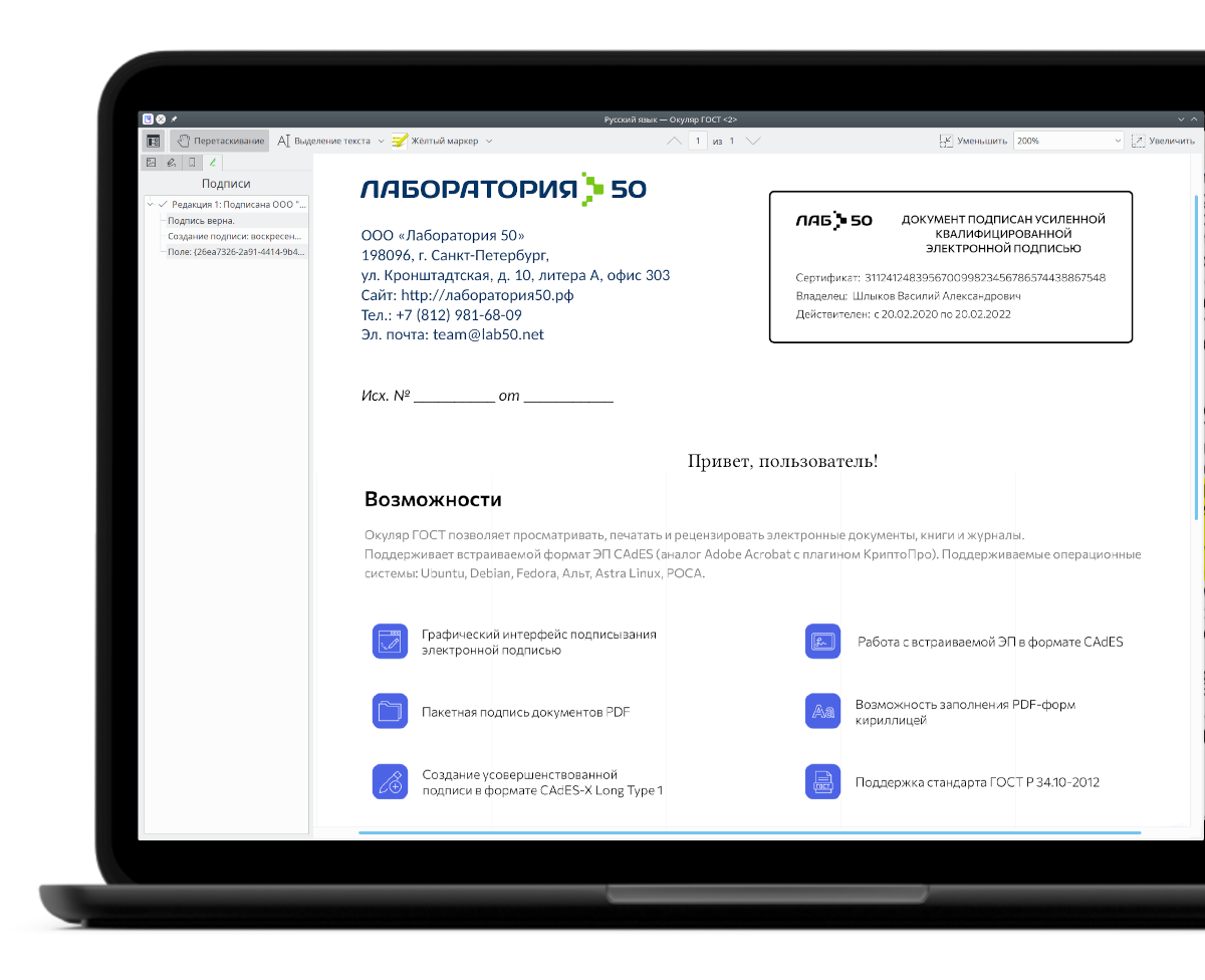 Окуляр ГОСТ поддерживает вставку цифровых подписей и отметок о проверке. Подпись может включать имя, должность и дату утверждения документа. Это востребованная функция для организаций, где документы проходят многоуровневое согласование.