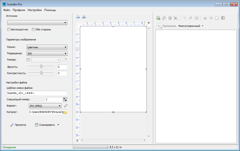 Scanitto Pro позволяет создавать несколько профилей для разных сценариев работы. Каждый профиль хранит параметры сканирования: формат, разрешение, цветность, директорию сохранения и настройки OCR. Это удобно при коллективном использовании программы в офисе.