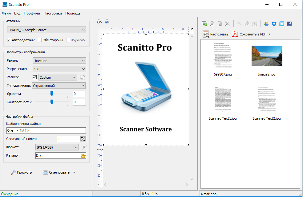 Если сканер оборудован автоподатчиком, Scanitto Pro автоматически определяет количество страниц и выполняет сканирование в непрерывном режиме. Пользователь может выбрать порядок сохранения, формат и имя для каждого файла.
