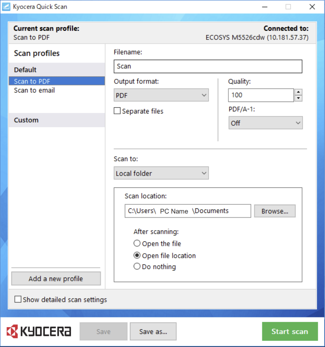 Kyocera Quick Scan позволяет создавать и сохранять профили сканирования с заранее определёнными параметрами: формат, цвет, разрешение, место сохранения, OCR и фильтры. Это экономит время при ежедневной работе.