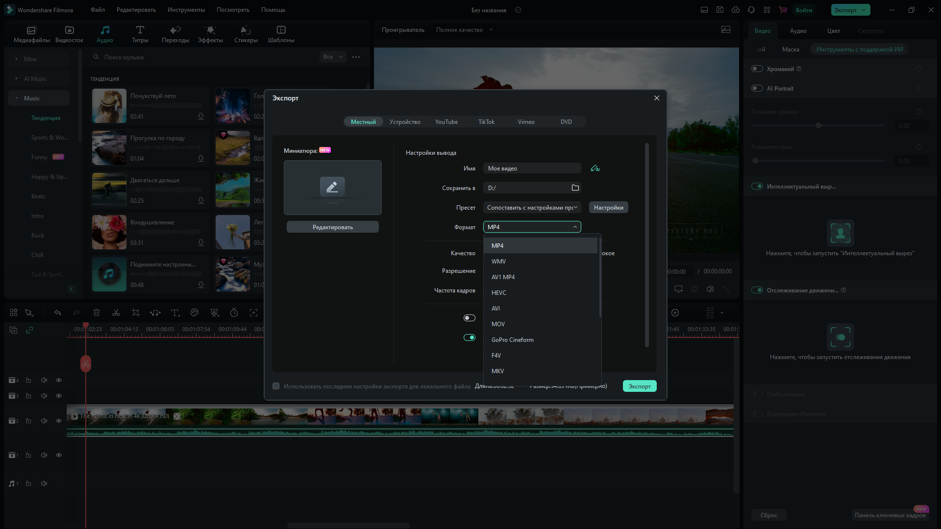 - Видео импорт: MP4, AVI, MOV, MKV, FLV, WMV, MTS, M2TS, WEBM, 3GP, TS, VOB, MOD, TOD и др.