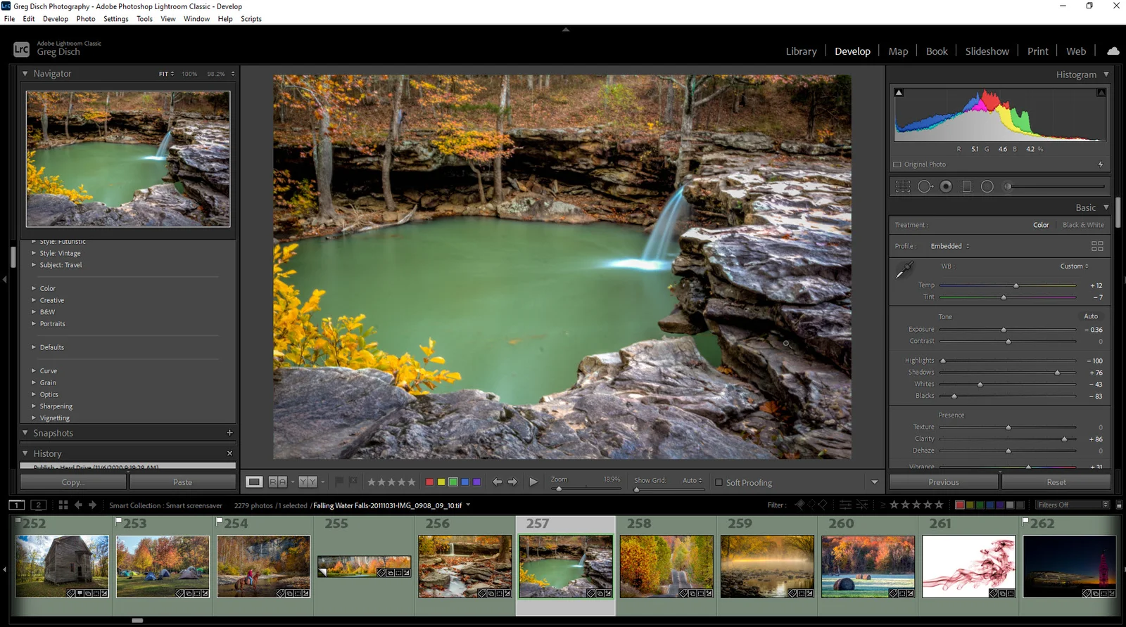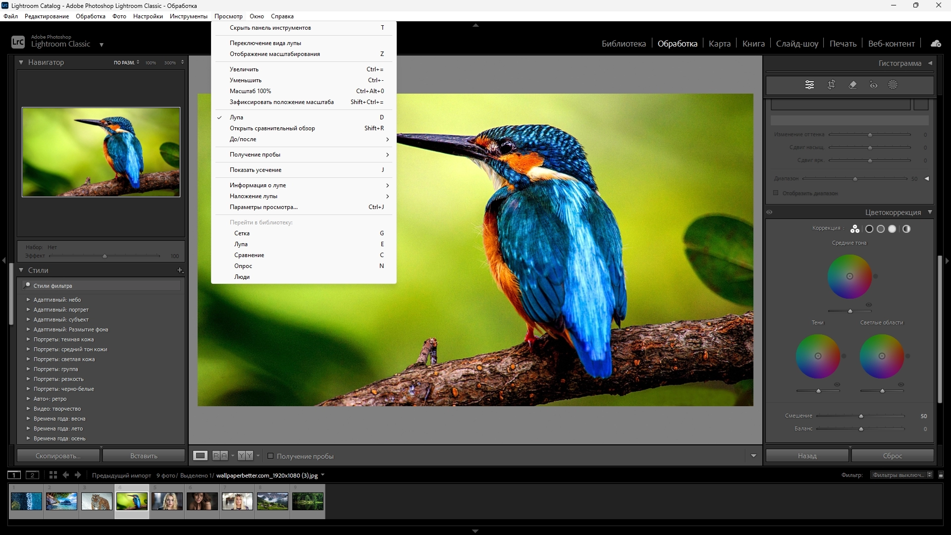 Модуль Develop отвечает за обработку изображений. Он содержит основные панели настройки экспозиции, цвета, контраста и резкости. Интерфейс интуитивен: слева расположены пресеты и история изменений, справа — инструменты коррекции. Панель внизу обеспечивает быстрый просмотр серии снимков и переключение между ними без выхода из модуля.
