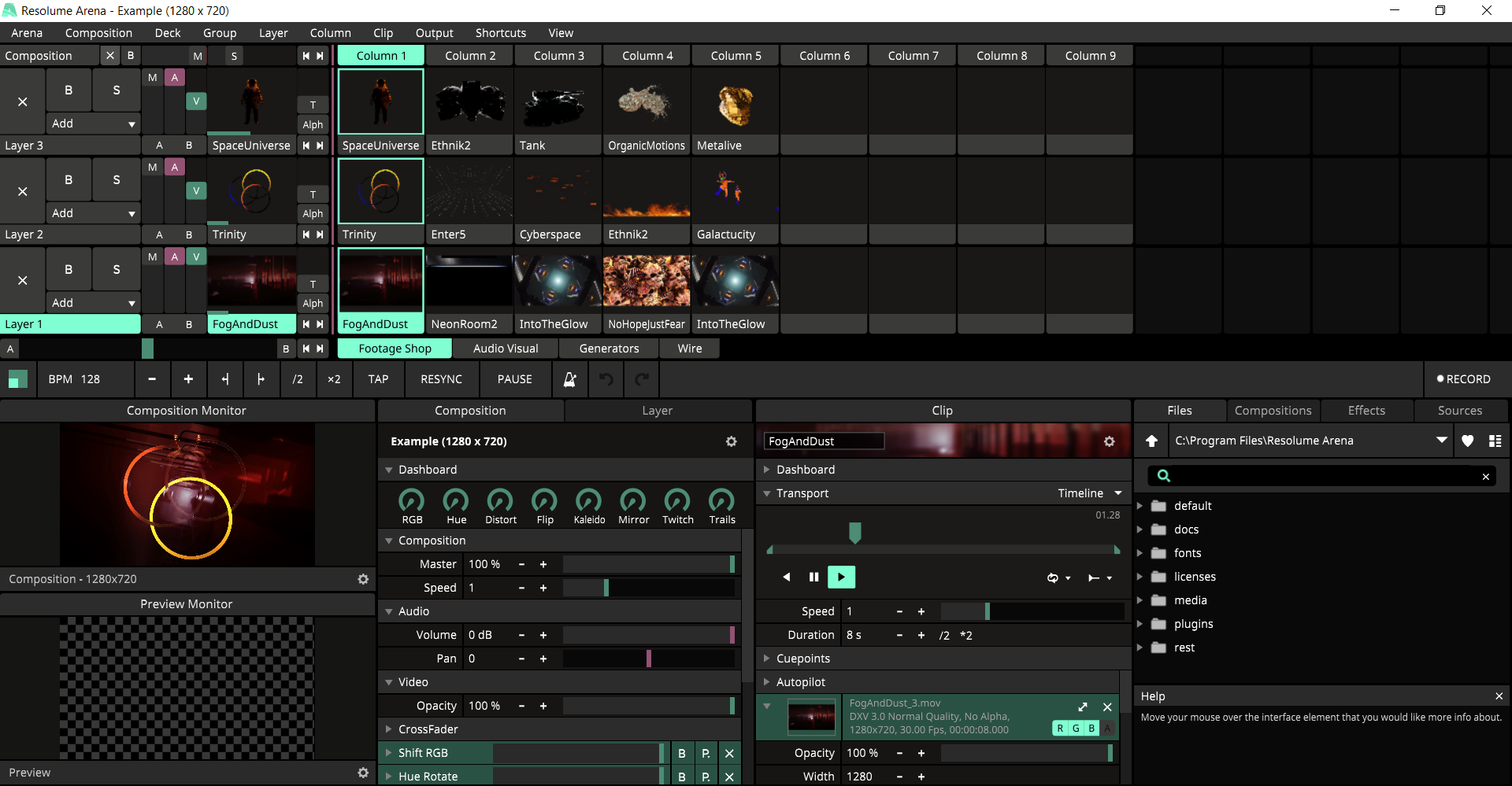 Программа позволяет свободно комбинировать слои, применять более 200 встроенных эффектов, синхронизировать визуалы с музыкой через аудио-анализ и управлять шоу через MIDI/DMX/OSC.