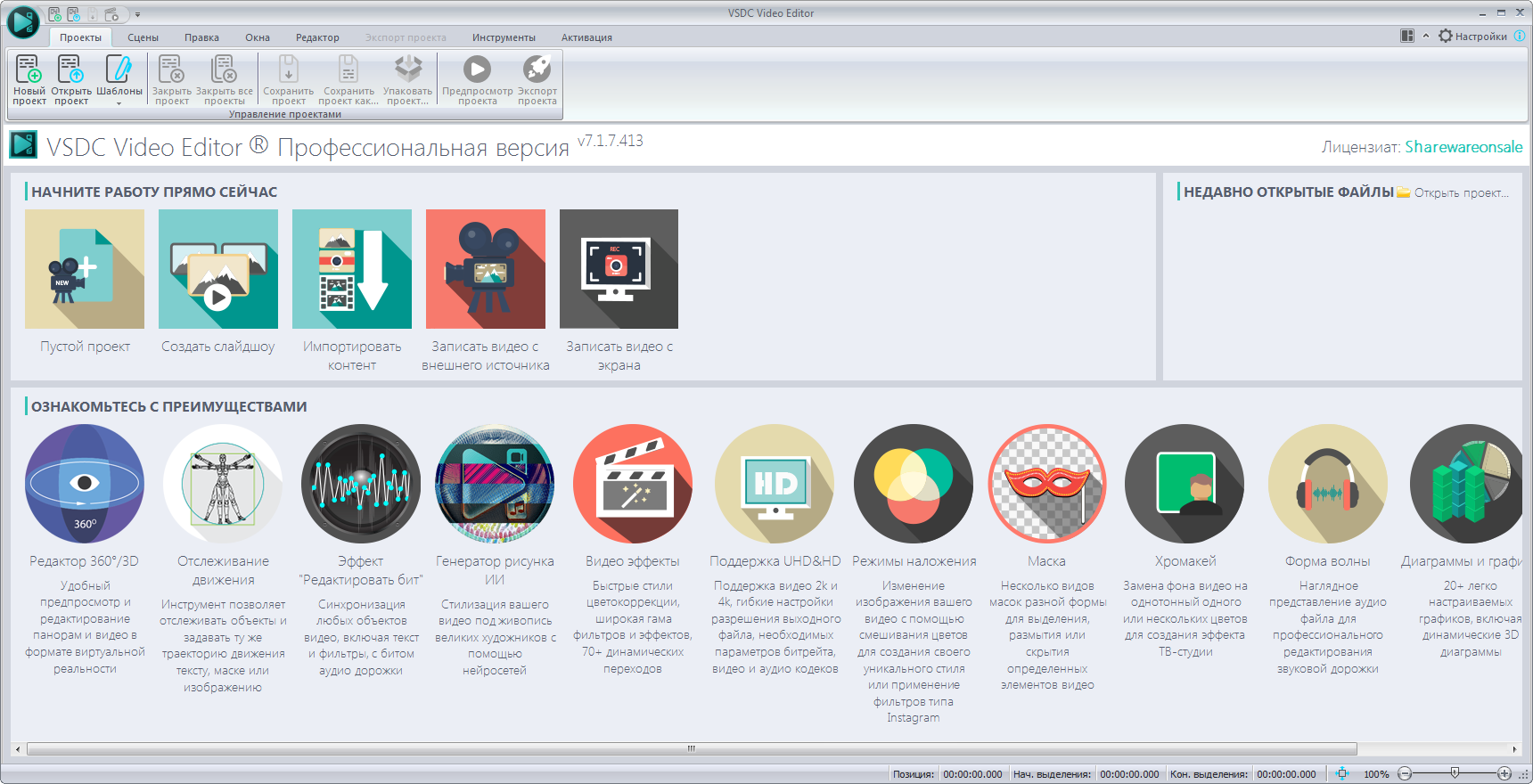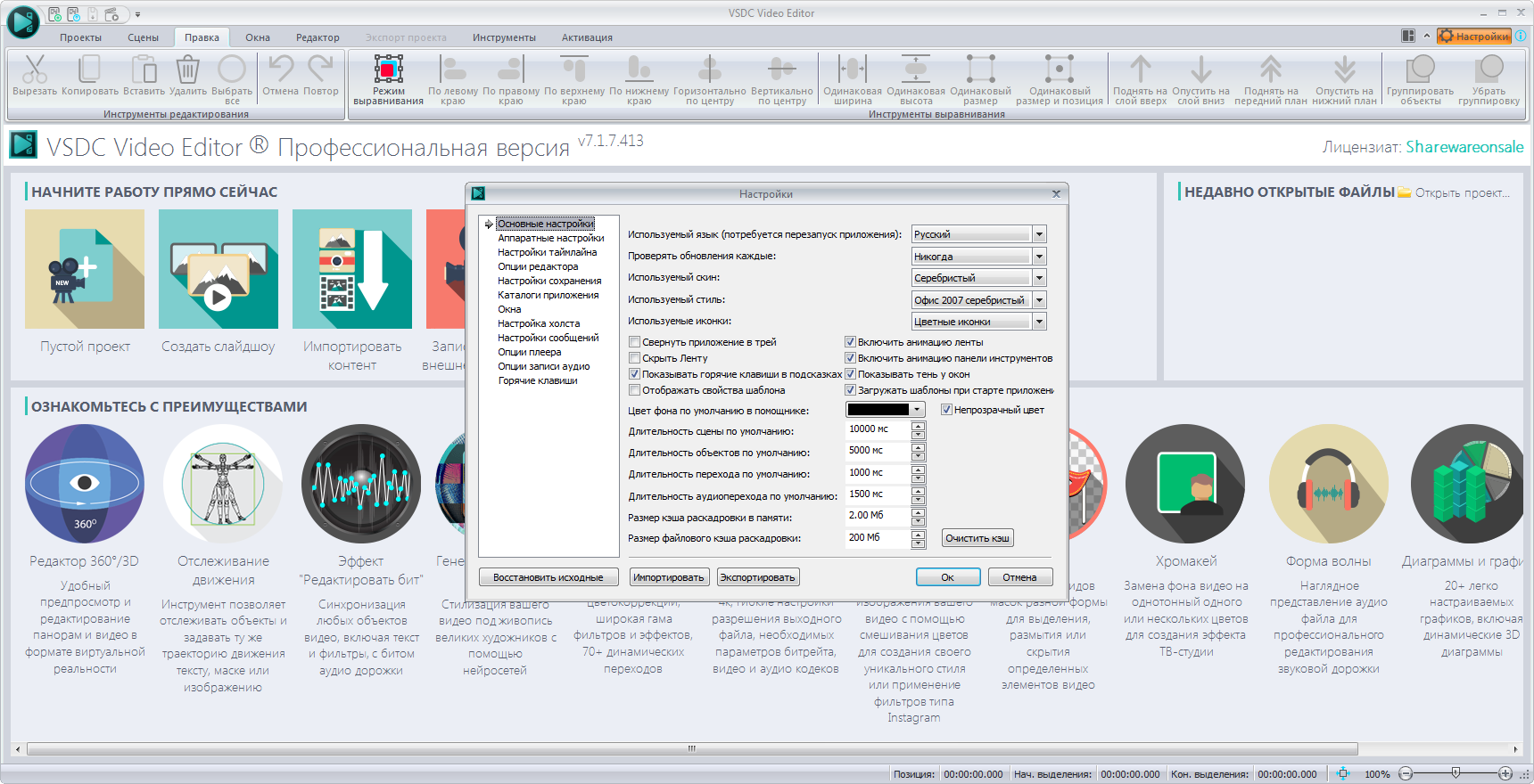VSDC Pro Video Editor (x32/x64) — мощный нелинейный видеоредактор с русским интерфейсом, поддержкой 4K, хромакея, масок, моушн-трекинга, стабилизации, цветокоррекции, 3D-графики и более 200 эффектов без ограничений по времени и водяных знаков.