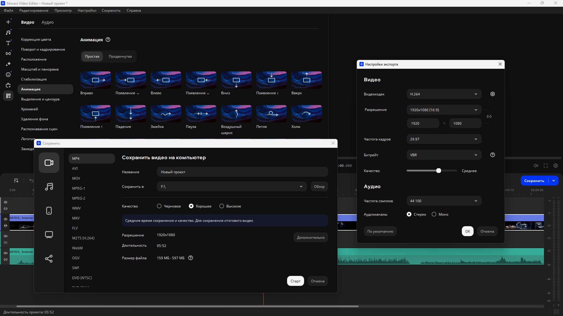 Программа поддерживает все популярные форматы (MP4, AVI, MKV, MOV, WMV, FLV, WEBM, 4K, 8K), не требует перекодирования при резке/склейке, предлагает готовые шаблоны, коллекцию эффектов прямо в интерфейсе, экспорт в любой формат, прямой постинг в соцсети и сохранение на мобильные устройства.