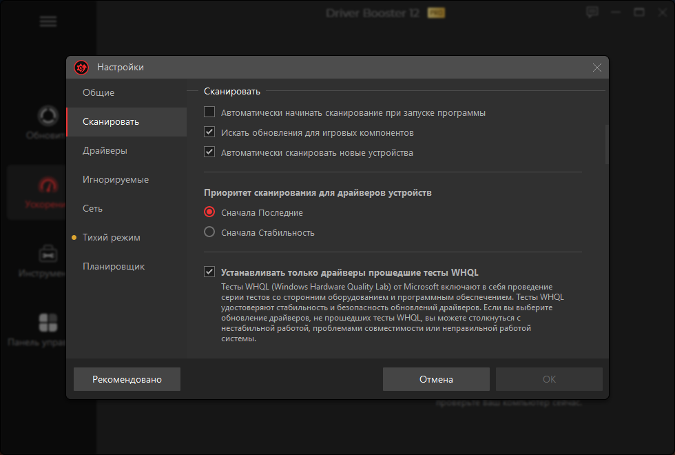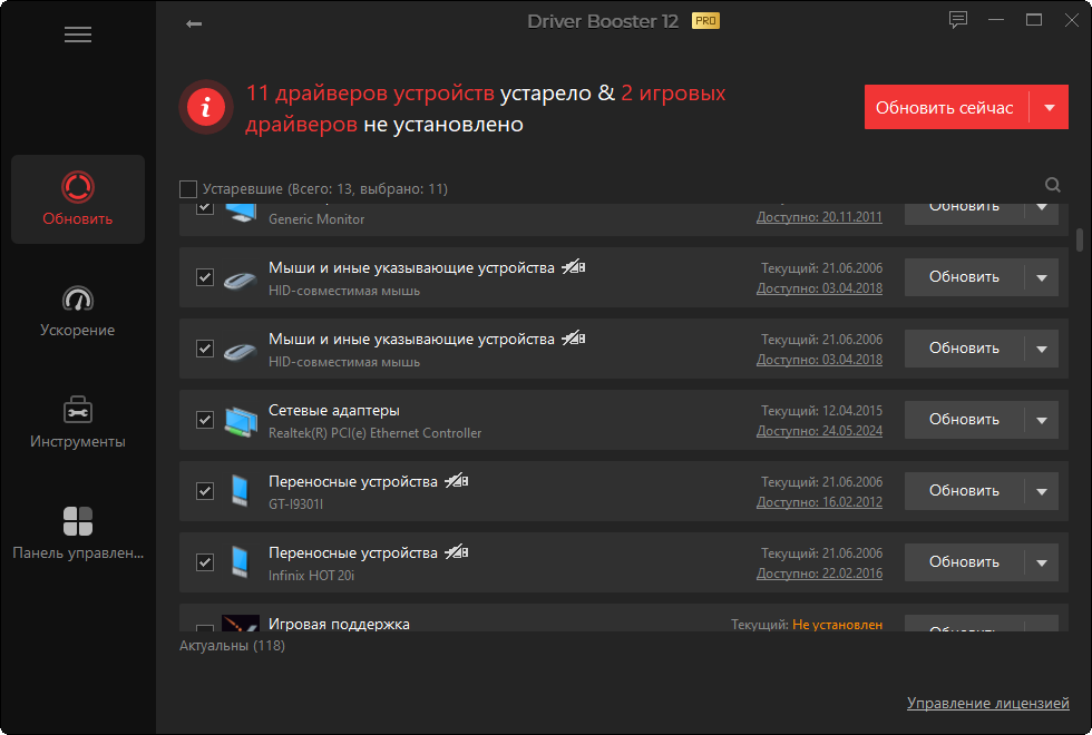 Driver Booster работает в фоне — сканирует и обновляет драйверы, когда ПК простаивает, сохраняет старые версии для отката и не отвлекает уведомлениями во время игр или работы.