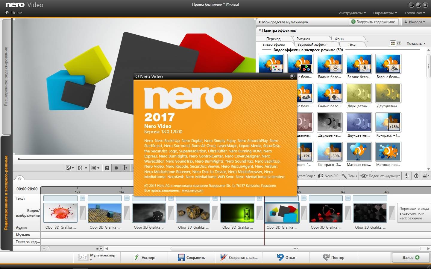 Nero Video 2017 v18.0.12000 RePack by MKN — мощный универсальный видеоредактор 2016 года с русским интерфейсом, предназначенный для создания профессиональных фильмов, слайд-шоу и дисков DVD/Blu-ray/AVCHD с анимированным меню, титрами, эффектами и объёмным звуком Dolby Digital 5.1 без сложных настроек и подписки.
