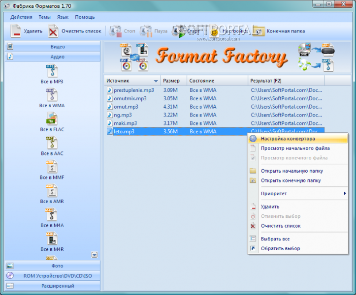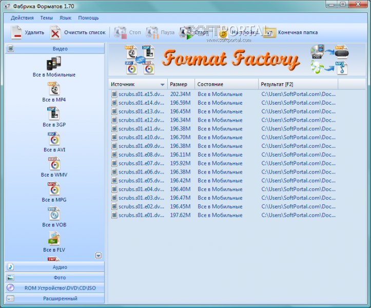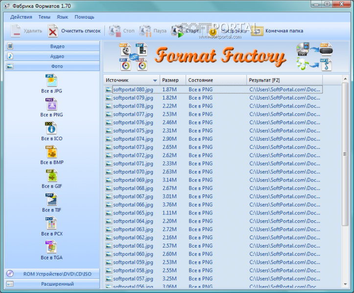Format Factory 2.90 — мощный бесплатный мультимедийный конвертер, поддерживающий преобразование всех популярных видеоформатов (MP4, 3GP, MPG, AVI, WMV, FLV, SWF, RMVB), аудиоформатов (MP3, WMA, AMR, OGG, AAC, WAV, MMF, M4A) и изображений (JPG, BMP, PNG, TIF, ICO, GIF, PCX, TGA).